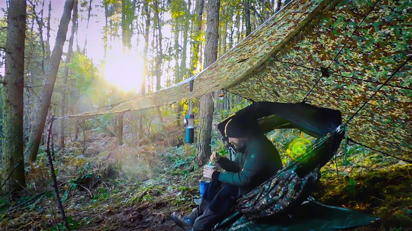 It was after work so I was up against it with the light, particularly as it was a completely alien process. I had done my homework though, and learned that there was a very specific angle and height of 'hang' which would optimise the comfort. I managed it fairly efficiently, added the under blanket and my usual 3x3m tarp above and was just about done before it was pitch black. The great thing is that it doubles as a rather comfy seat, and I enjoyed a cooked tea and a canteen of wine into the evening.